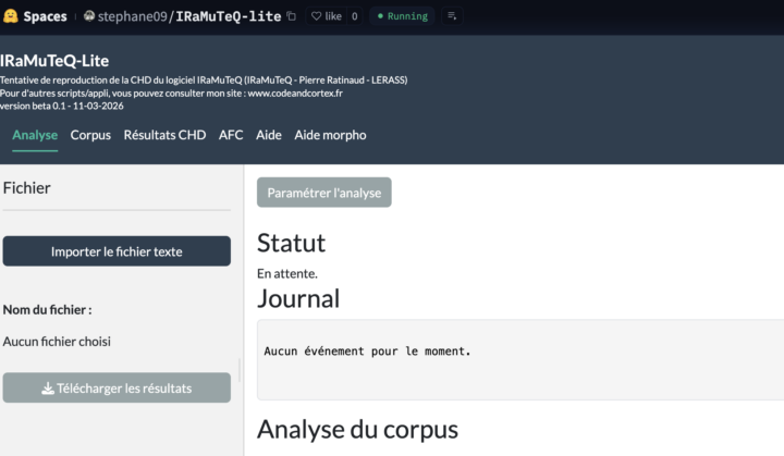 Cette application s’inscrit dans une logique de reproductibilité des résultats d’une CHD à partir d’un même corpus texte, en comparaison avec ceux produits par le (vrai) logiciel IRaMuTeQ, (Pierre Ratinaud – Laboratoire d’Études et de Recherches Appliquées en Sciences Sociales (LERASS) – Université Toulouse Jean-Jaurès) – qui reste le logiciel de référence libre dans ce domaine...