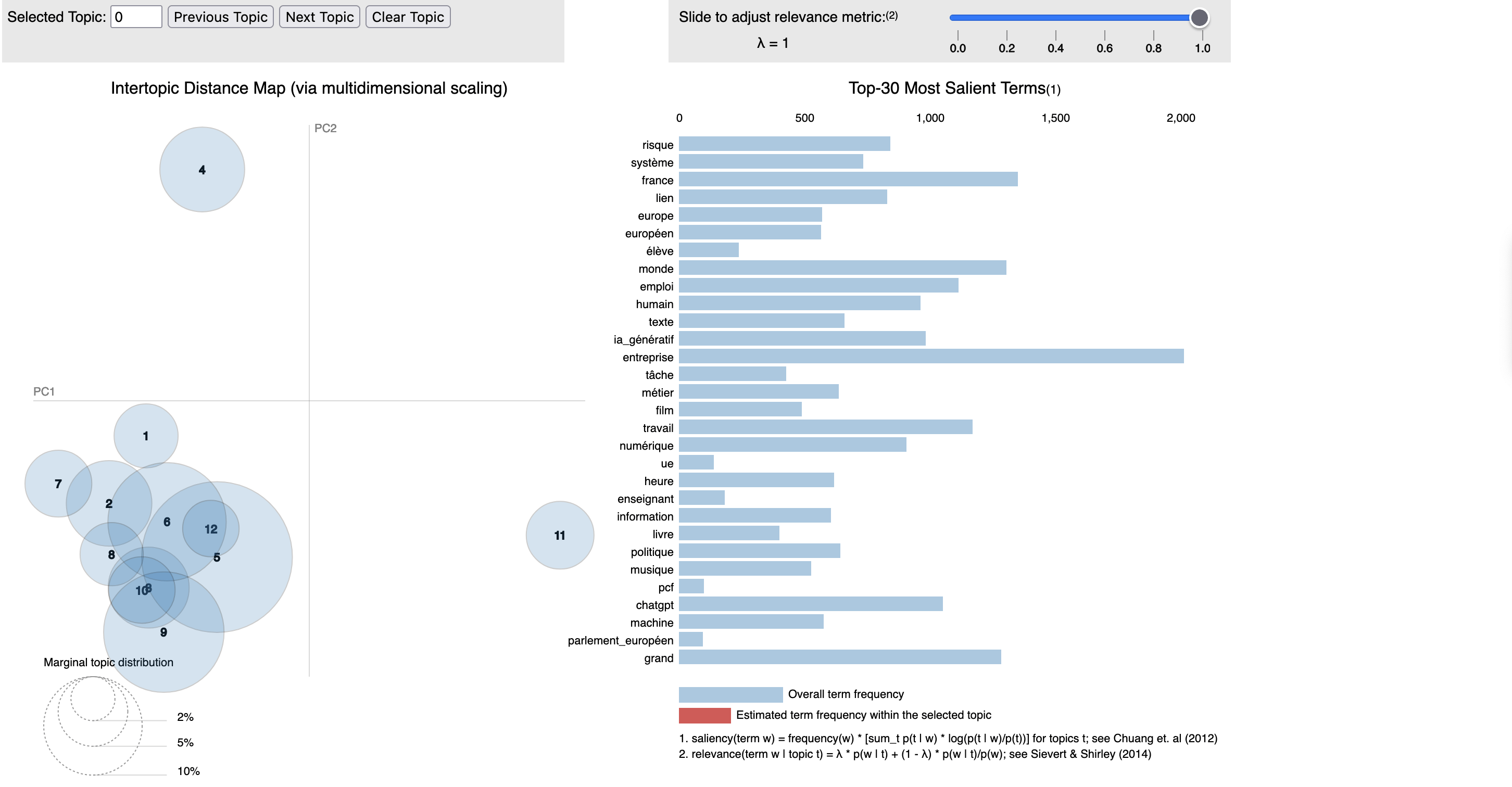 La métrique de pertinence dans l’interface de visualisation de pyLDAvis (en haut à droite du graphique) est un moyen de filtrer les mots clés qui apparaissent dans chaque topic pour mieux comprendre les thèmes représentés dans le corpus. Cette métrique ajuste l’équilibre entre la fréquence des mots et leur spécificité ou exclusivité par rapport à ce topic.