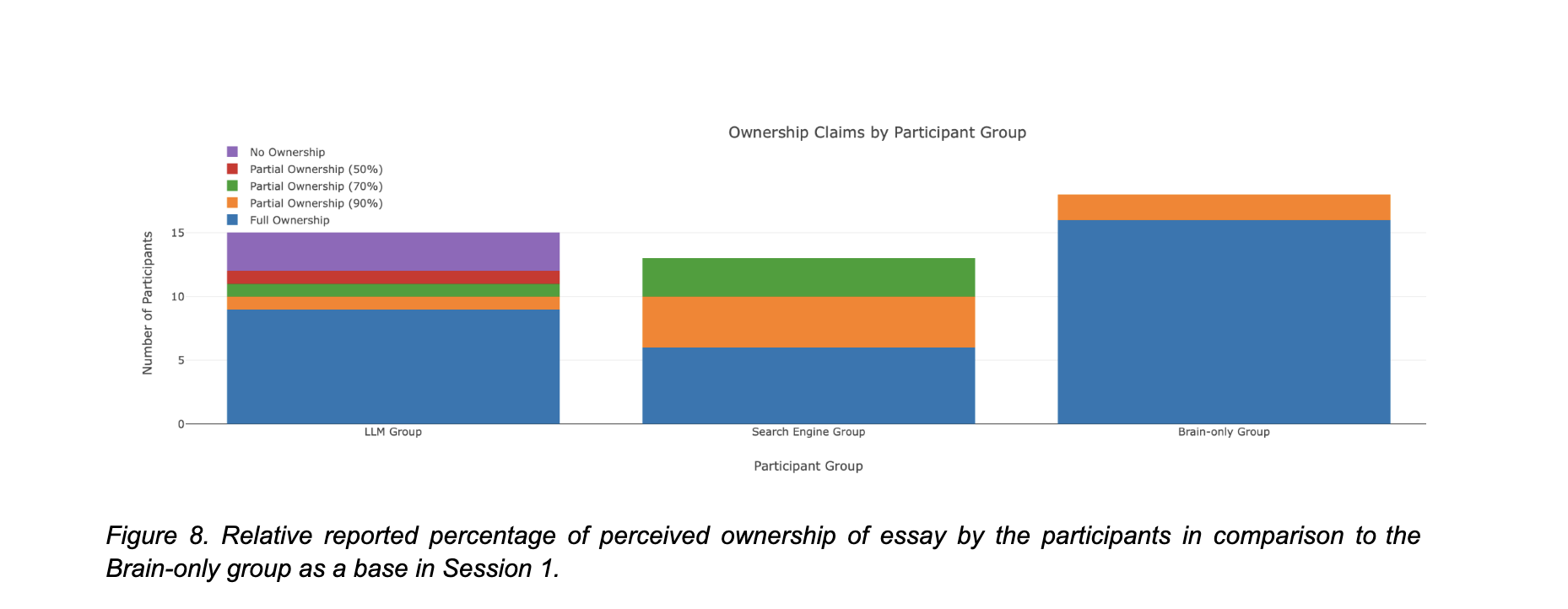 Les résultats montrent une corrélation entre le niveau d’assistance et la diminution du sentiment de propriété intellectuelle. Le groupe “Brain-Only” affiche le niveau le plus élevé : 16/18 déclarent une pleine panternité.