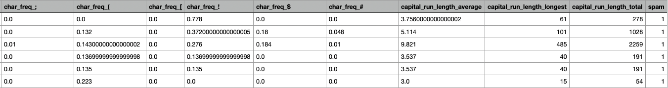 Exemples : La caractéristique word_freq_free mesure la part de mots “free” dans l’e-mail ; une valeur de 2,0 signifie que 2 % des mots sont ” free “. La variable char_freq_! égale à 5,0 signifie que 5 % des caractères du message sont des “!“.