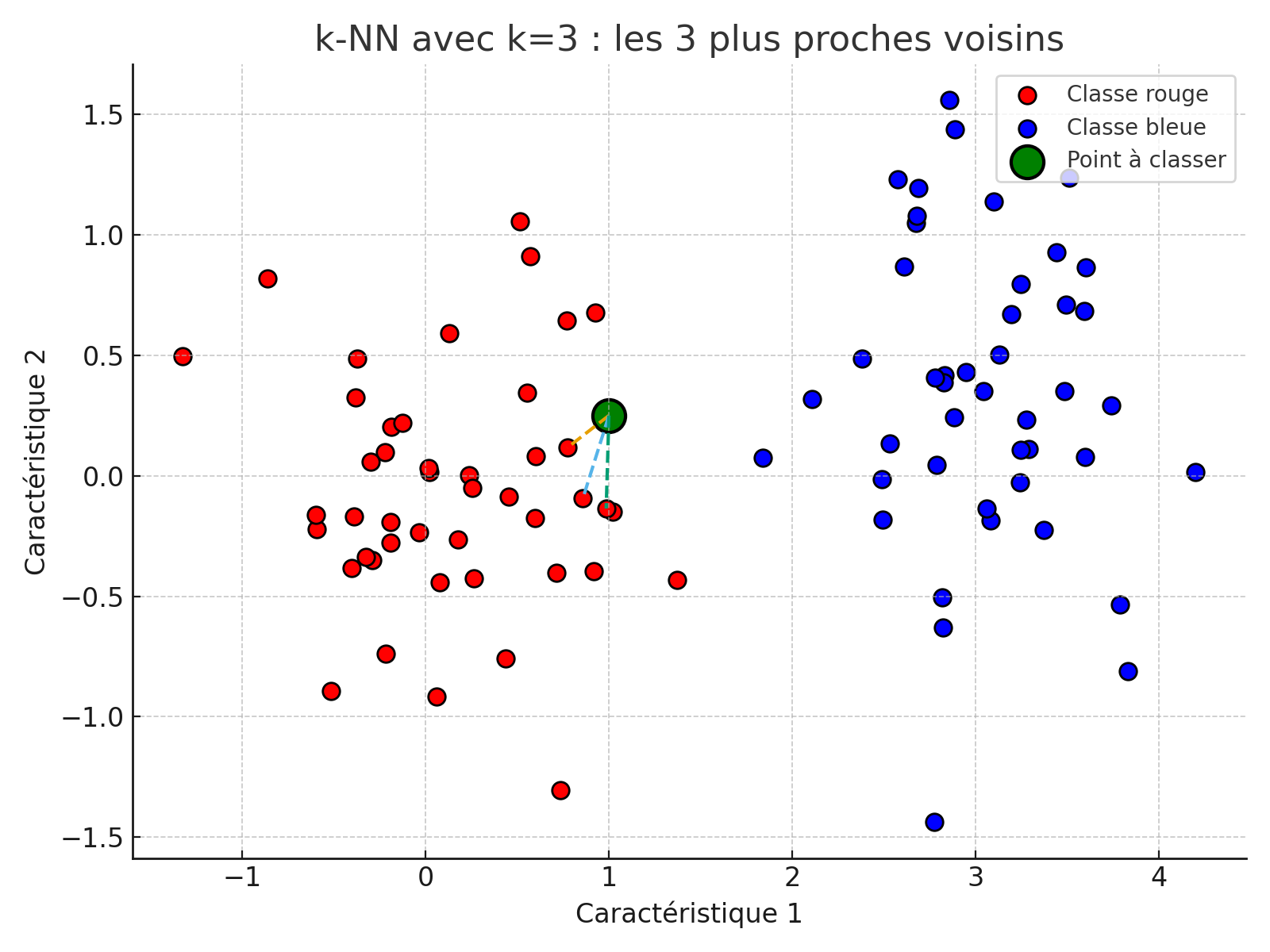 Dans sa forme la plus simple, l’algorithme du plus proche voisin, dans sa version à 1 voisin, n’est pas la plus efficace. On utilise généralement les k-voisins plus proches, pour ensuite assimiler notre point à la classe majoritaire parmi ces k-voisins.