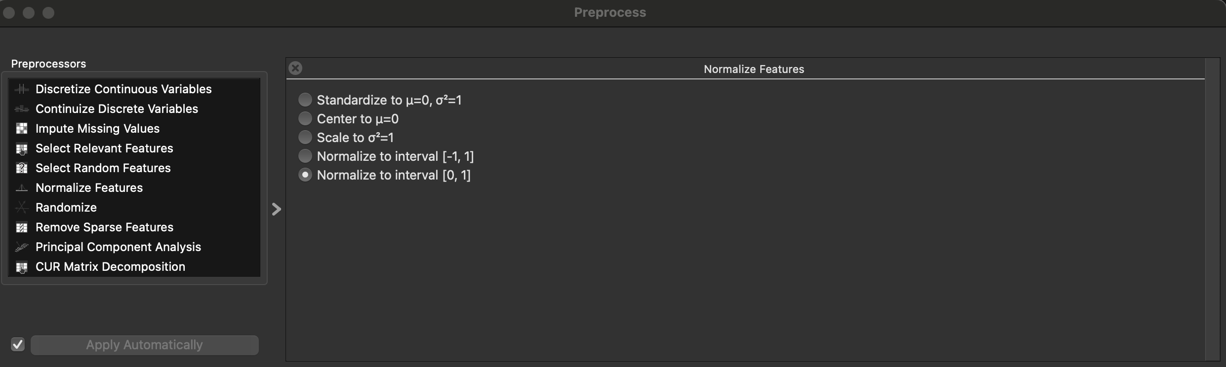 Dans Orange Data mining il est possible d’ajouter le widget Preprocess afin de normaliser les données.