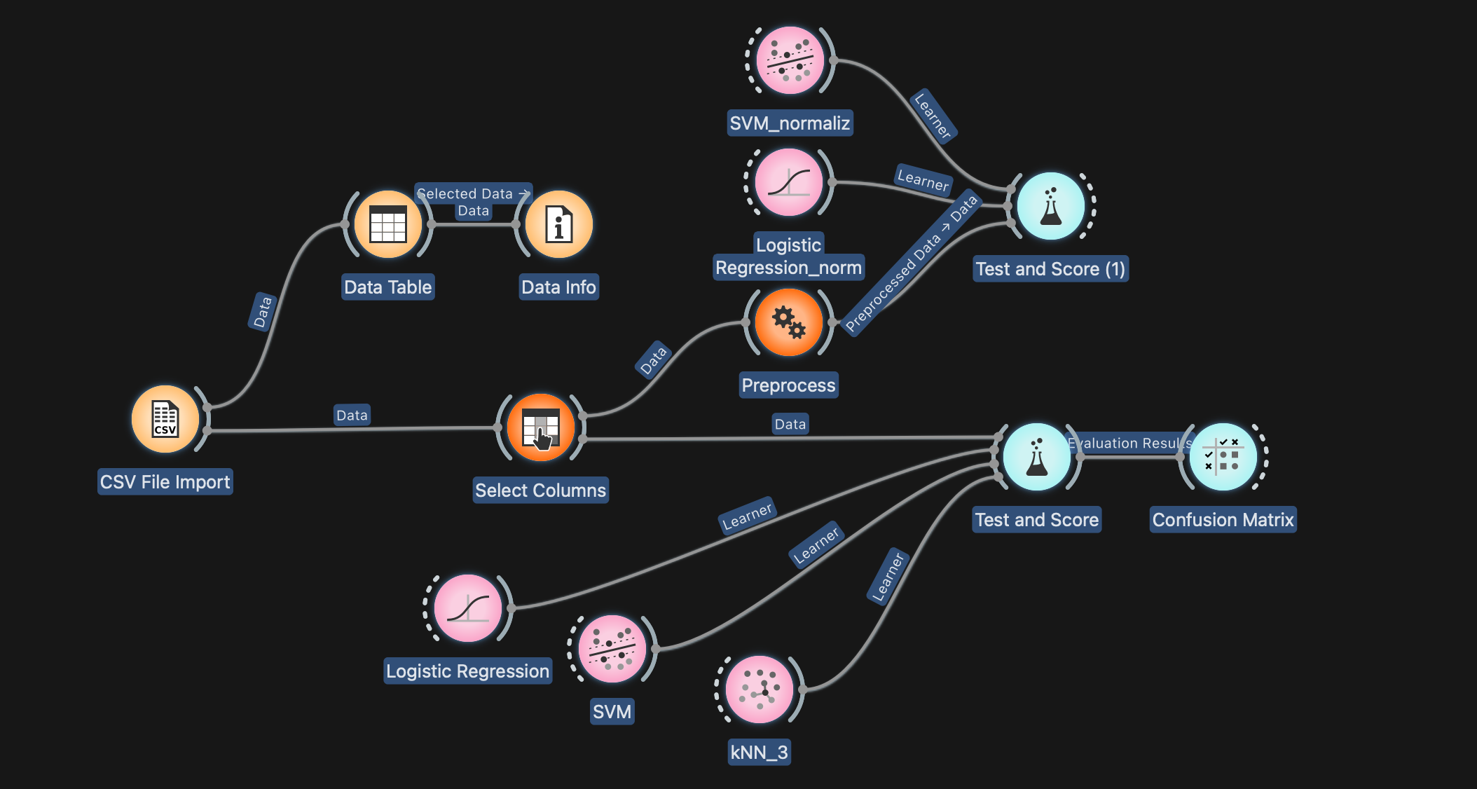 L’intérêt d’Orange Data mining est de permettre, par simple enchaînement de widgets de construire un workflow reproductible pour entraîner les modèles, prédire sur les données de test et évaluer leurs précisions (accuracy).