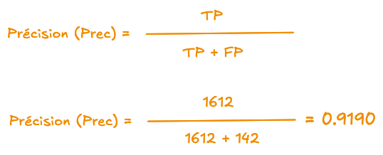 Voici les éléments qui permettent de comprendre comment les scores sont calculés (matrice de confusion (lignes = Réel, colonnes = Prédiction par le modèle)