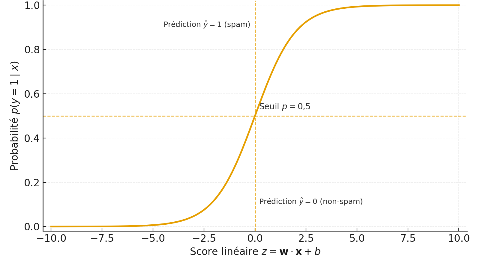 La régression logistique est donc un modèle de classification binaire qui calcule la probabilité qu’un e-mail appartienne à la classe “spam”.