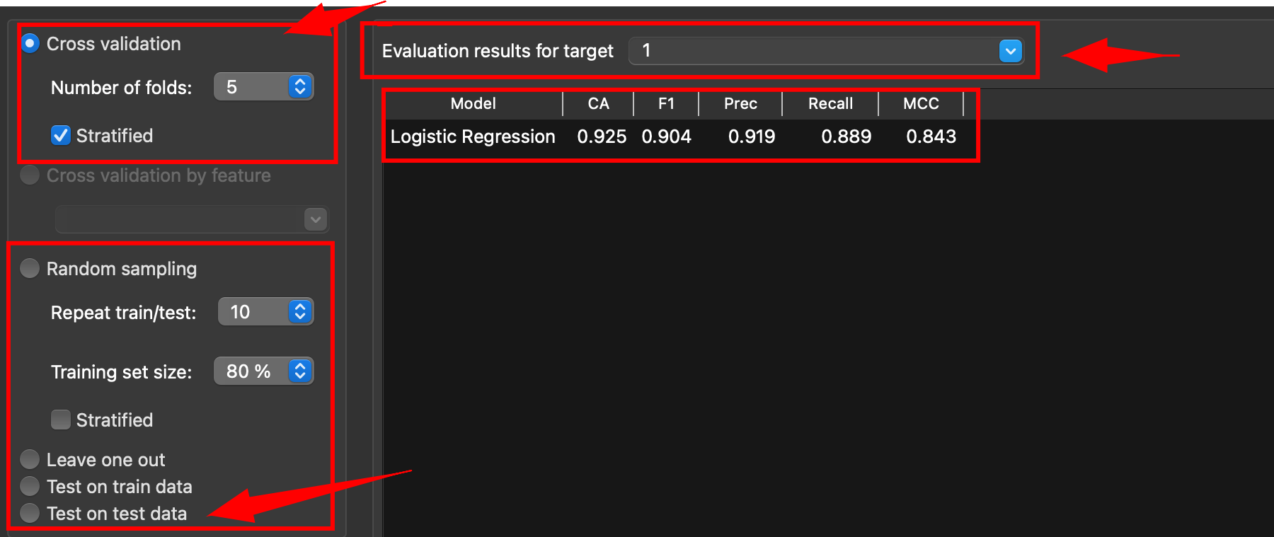 Par défaut, dans Orange Data Mining, l’option « Cross validation » (validation croisée) est cochée. Cela veut dire que le dataset est découpé en “k” parts de taille comparable. On entraîne le modèle sur k parts et on le teste sur la part restante. On recommence k fois en changeant la part qui sert de test, puis on fait la moyenne des résultats.