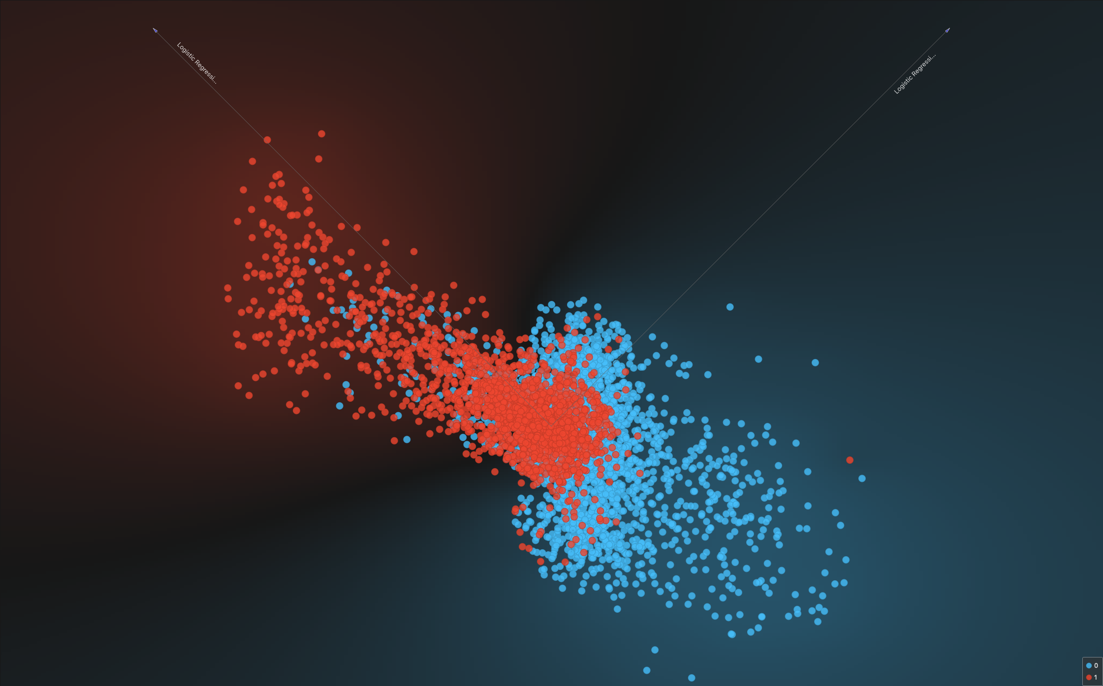 Personnellement, je n’ai pas réussi (ou j’ai manqué une étape ?) à obtenir une représentation (bien linéaire) de la frontière de décision. Si vous avez la solution, je suis preneur.