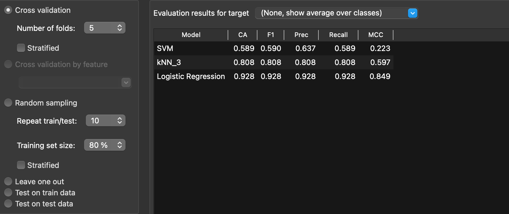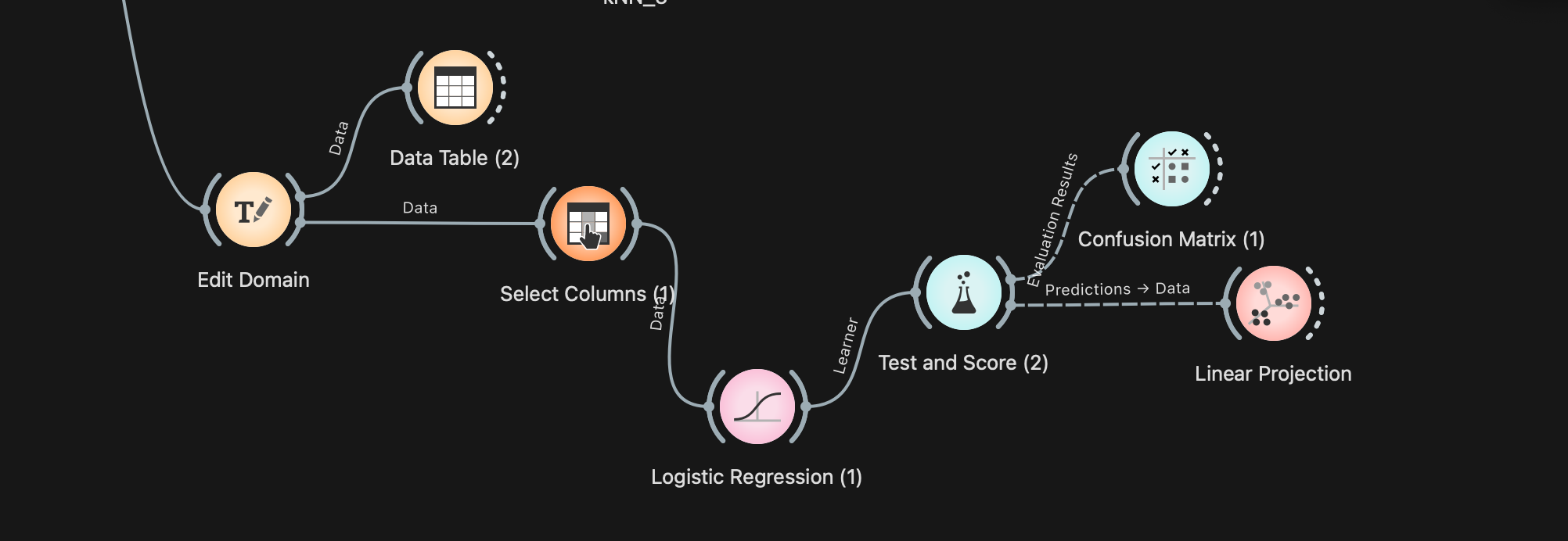 L’intérêt d’Orange Data mining est de permettre, par simple enchaînement de widgets de construire un workflow reproductible pour entraîner les modèles, prédire sur les données de test et évaluer leurs précisions (accuracy).