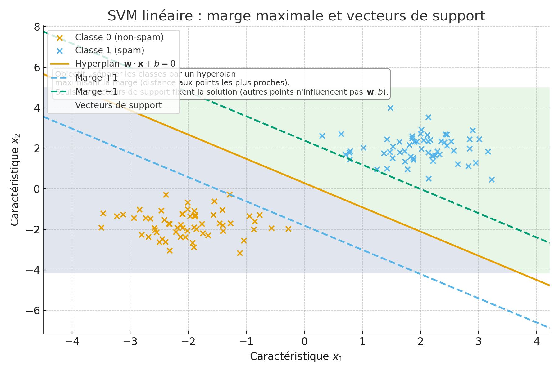 Un SVM cherche une frontière qui sépare deux classes en maximisant la marge, c’est-à-dire la distance entre la frontière et les points les plus proches de chaque classe, appelés vecteurs de support.