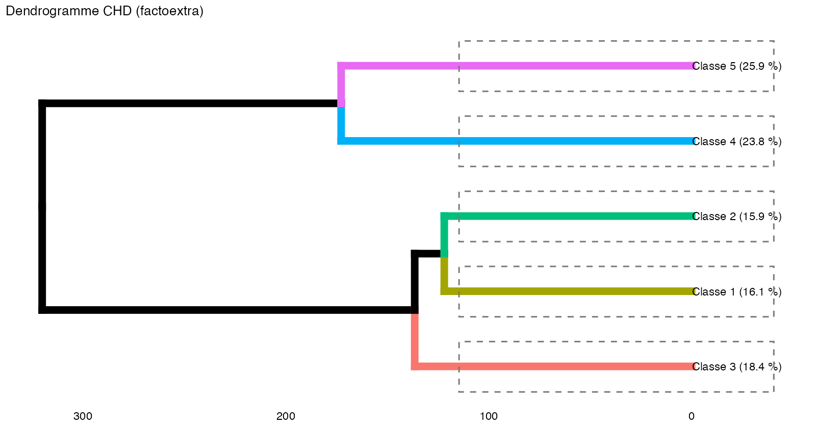 D’un point de vue du calcul, le script reprend une logique de reproduction qui tient notamment au fait que le nombre de classes k n’est pas défini en amont, comme avec Rainette. Dans Rainette, vous pouvez par exemple définir k = 8 (k = classes) et, dans l’interface “rainette_explor” (affichage des résultats), diminuer le nombre de classes afin d’observer la meilleure répartition / segmentation. C’est un peu la logique de tâtonnement avec rainette : il vaut mieux afficher au départ un nombre élevé de clusters ou de classes, puis le réduire ensuite.