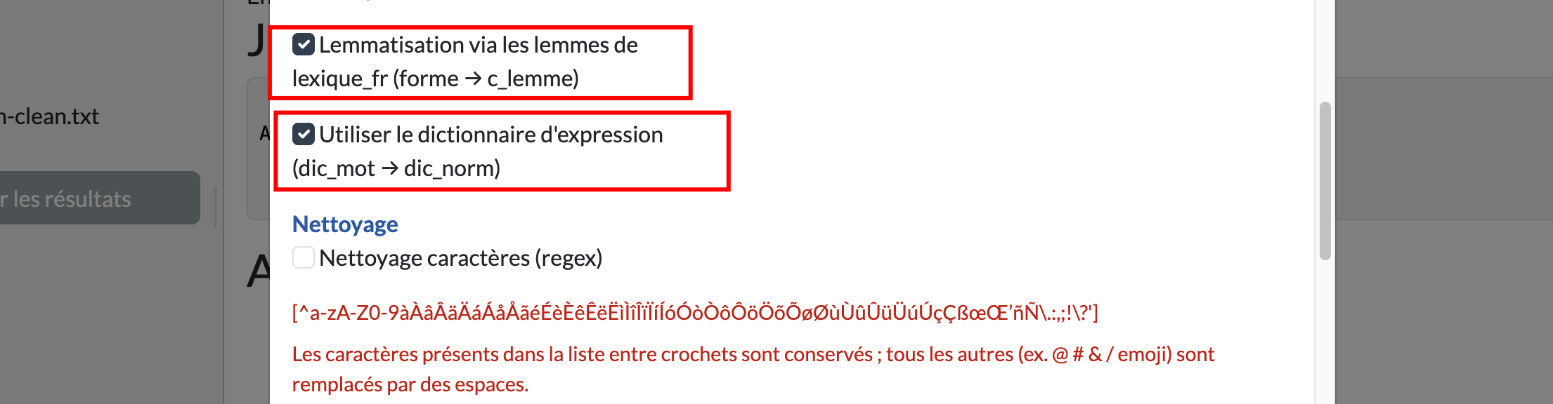 Il existe aussi des écarts sur les options de nettoyage du texte. Elles ne sont pas toutes strictement identiques à celles du logiciel. Par exemple, l’application permet d’activer les stopwords de quanteda, ce qui n’existe pas sous cette forme dans IRaMuTeQ.