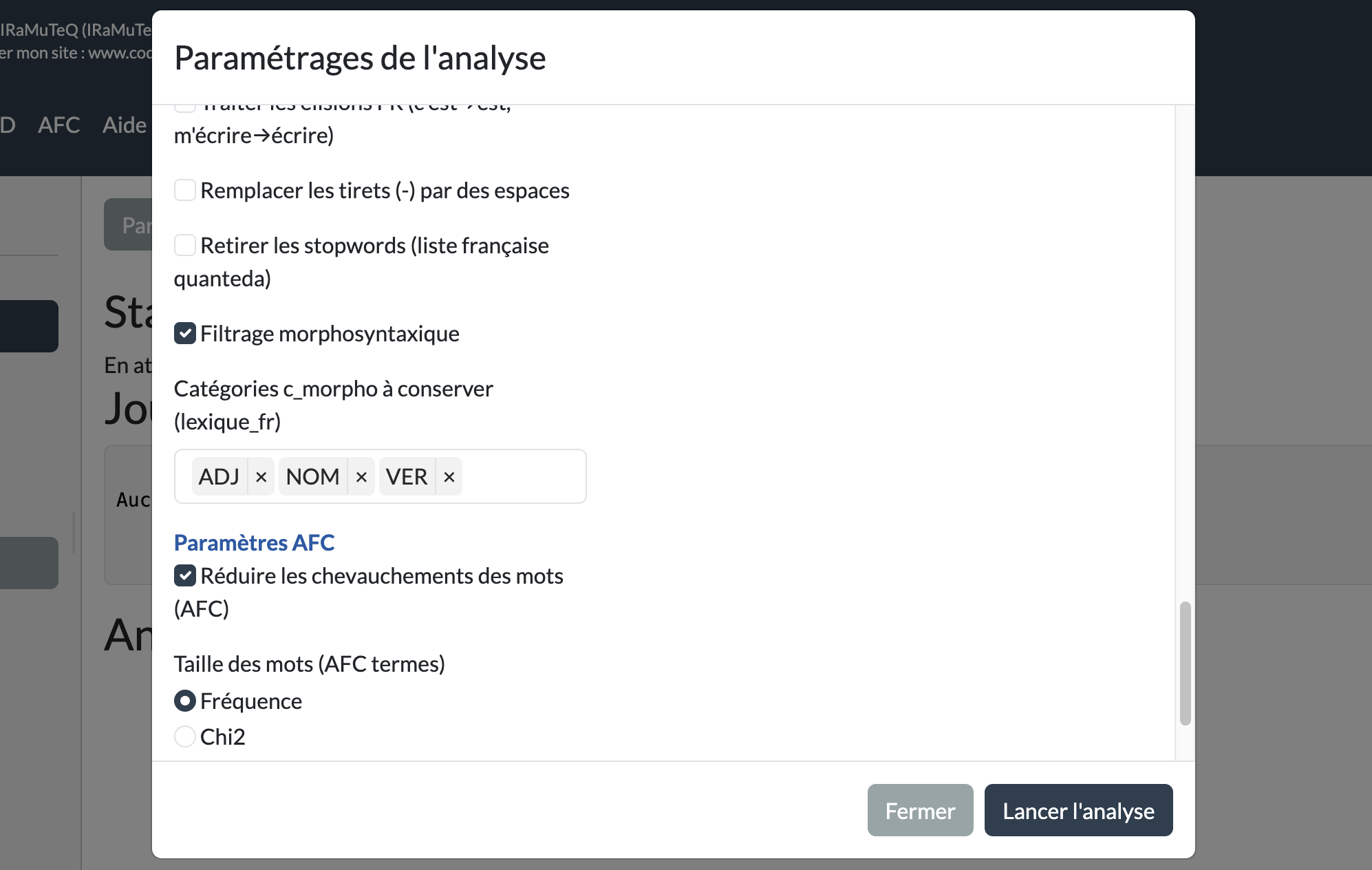 Dans cette application, l’utilisateur choisit directement dans l’interface les catégories morphosyntaxiques qu’il souhaite conserver. On est donc dans une logique binaire de présence ou d’absence des catégories retenues dans le calcul.