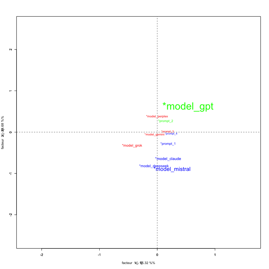 Cette étude se base sur les réponses des modèles de langage, mais il faut savoir que ces réponses ne sont pas strictement reproductibles : à prompt identique, deux personnes n’obtiennent jamais exactement le même texte. Cela tient au (hyper)paramètre de “température” (entropie de Shannon) qui régule la diversité des mots générés ; plus le paramètre “température” est bas, plus les réponses sont uniformes, et inversement. Ce réglage n’est pas accessible à l’utilisateur, mais il joue sur la variabilité des réponses.