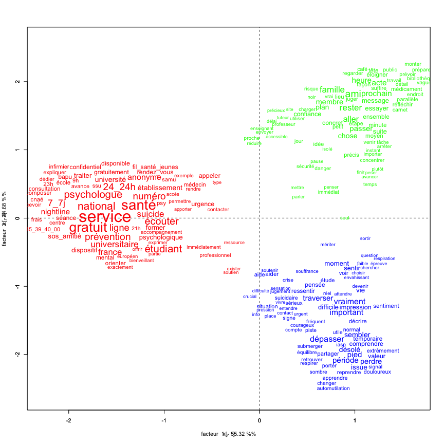 L’urgence de la situation est traitée par une temporalité, marquée par les formes 24_24h (khi² = 36,8) et 7_7j (khi² = 32,2), tout en garantissant un cadre sécurisant via les notions d’anonyme (khi² = 26,1) et de confidentiel (khi² = 12,47). Des dispositifs spécifiques sont explicitement cités, tels que nightline (khi² = 23,30), le Fil_Santé_Jeunes (khi² = 13,17) ou des séquences numériques comme le 0_800_235_236 (khi² = 6,16).