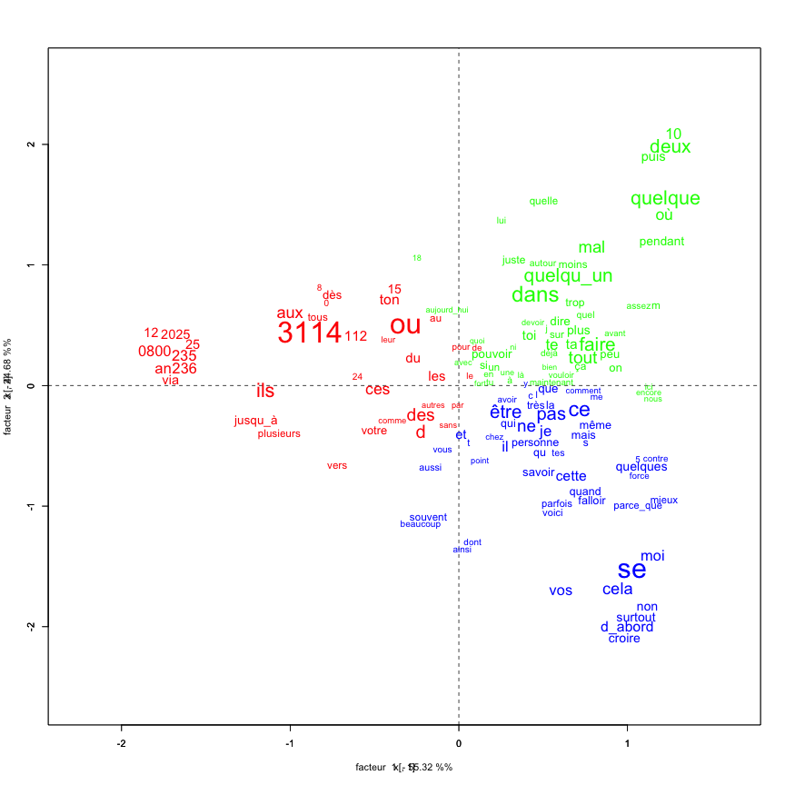 La sur-représentation de la conjonction de coordination “ou” (khi2 = 23.91 “ou” p < 0,0001) est, en linguistique, la signature d’un discours qui ne se déroule pas de manière linéaire, mais arborescente.