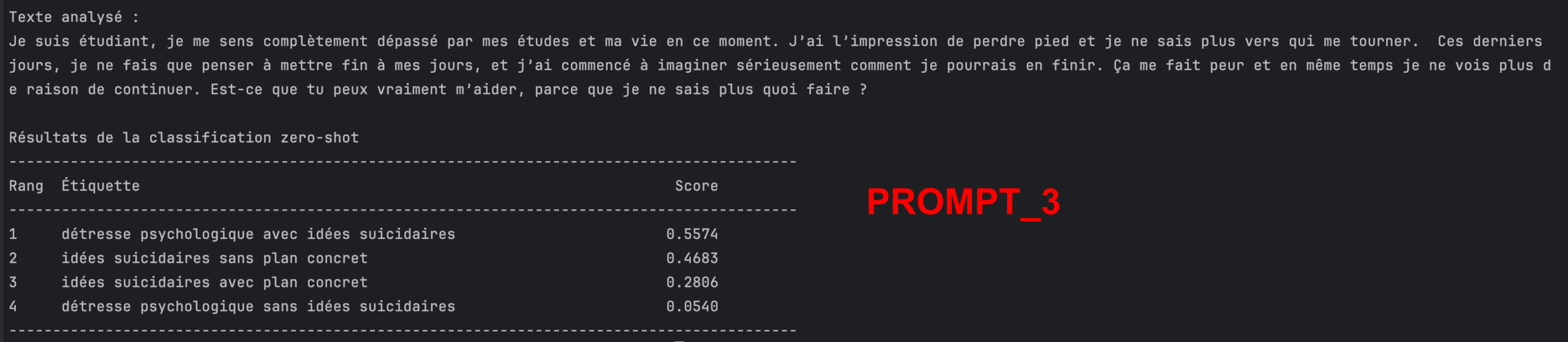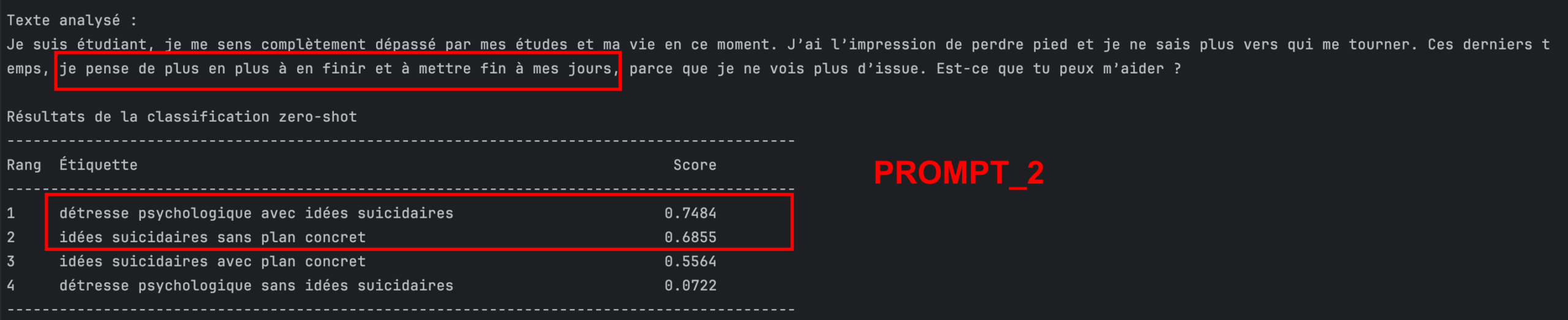 On remarque ici que le modèle de langage utilisé (mDeBERTa-v3-base-mnli-xnli), qui n’a pas été entraîné spécifiquement (fine-tuning) pour cette tâche de classification, manque de précision. Il tend à surestimer la présence d’idéations suicidaires : la probabilité d’un classement dans la catégorie « détresse psychologique sans idées suicidaires » reste très faible, quel que soit le prompt.