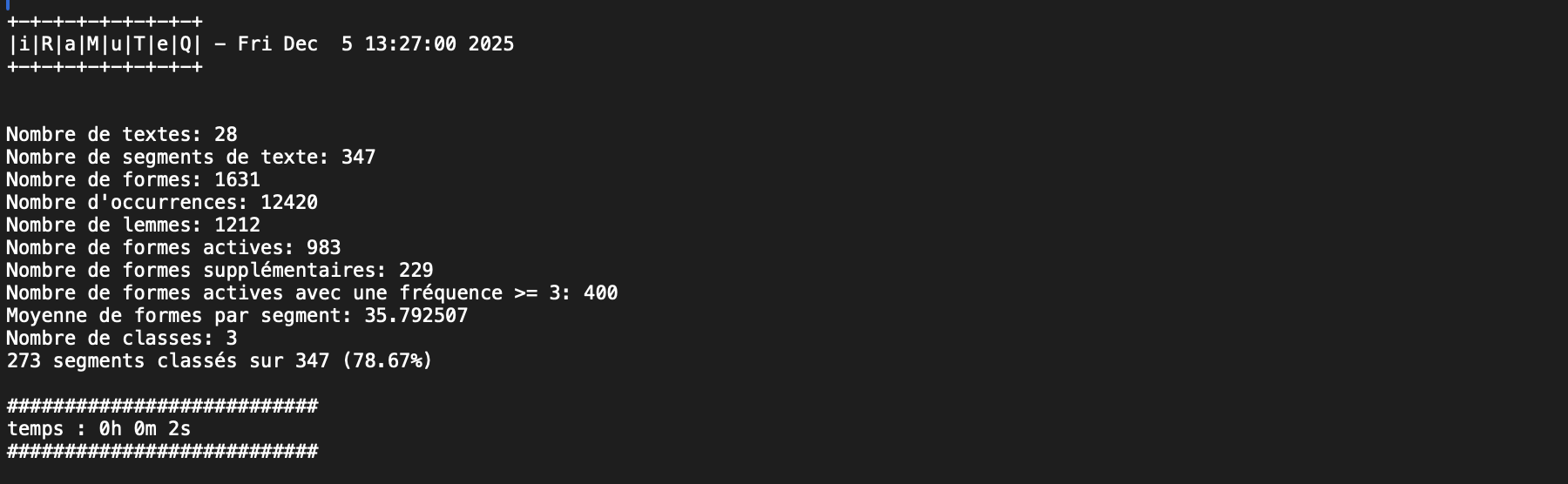 Le corpus est donc composé de 28 textes (4 prompts × 7 LLM), découpé par la CHD en 273 segments de texte (sur un total de 347) ; il contient 469 hapax (mots apparaissant une seule fois).