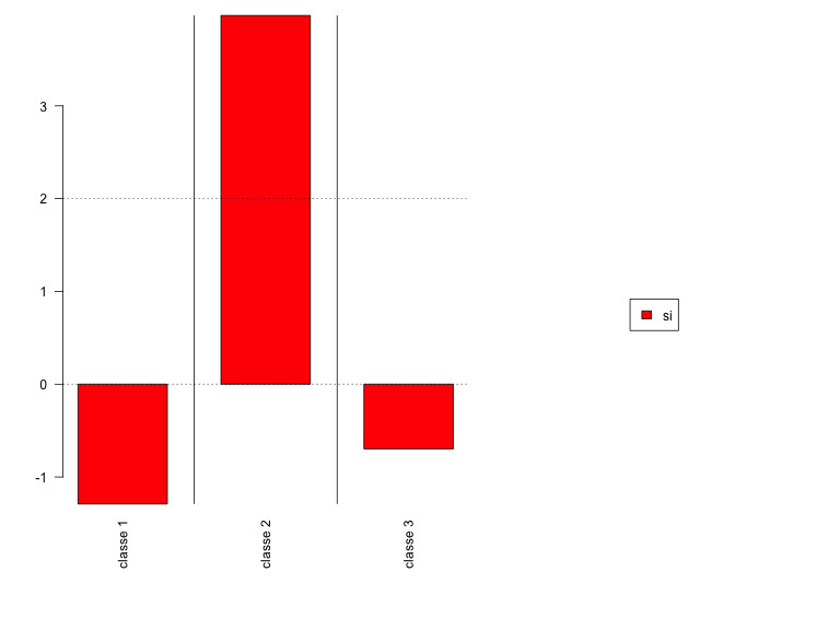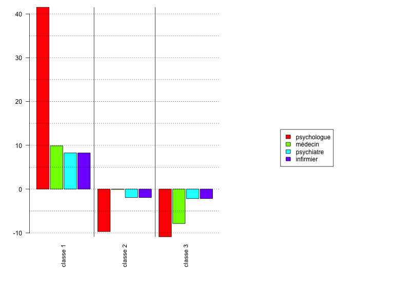 Le graphique ci‑dessous (scores de khi²) qui compare la contribution des quatre professions (psychologue, infirmier, médecin et psychiatre) aux trois classes, met en évidence que seules les formes liées aux professions sont positives dans la classe 1 et négatives dans les classes 2 et 3.
