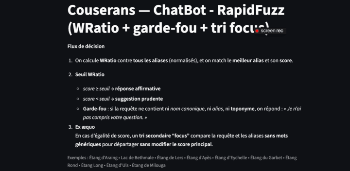 Quand deux (ou plusieurs) lacs obtiennent le même score WRatio avec la requête complète, on calcule un deuxième score (non affiché) sur des versions “sans stopwords“ de la requête et de chaque alias. Ainsi on applique toujours la normalisation et on retire les mots génériques (stopwords spécifiques à notre analyse : “lac”, “étang”, “de/du/des”, “le/la/les”, “sur”, …) ;