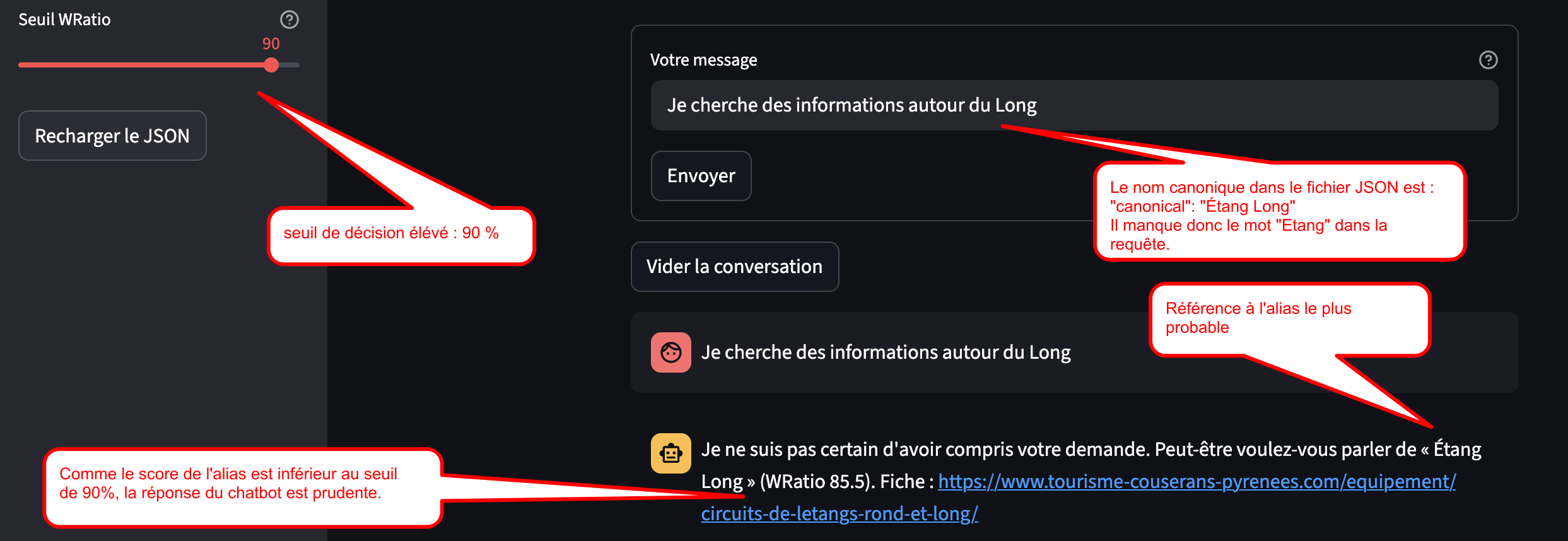 La réponse du ChatBot est conditionnelle selon un seuil WRatio (par défaut 80, modifiable dans la barre latérale de l’interface Streamlit).
