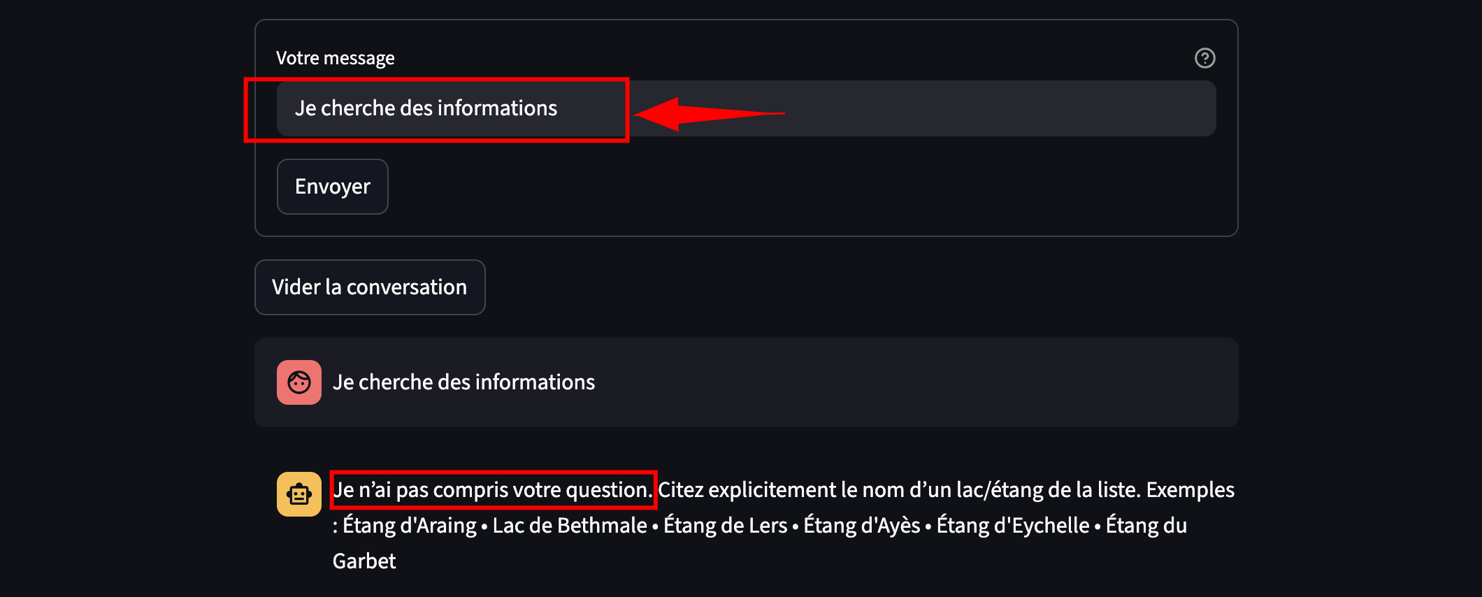 Comme il est probable que vous ne connaissiez pas cette région, l’application affiche, juste sous le titre, la liste des lacs présents dans le fichier JSON. Cela vous permet de formuler vos propres requêtes et, si vous le souhaitez, de tester la robustesse du chatbot en introduisant volontairement des fautes dans vos questions.