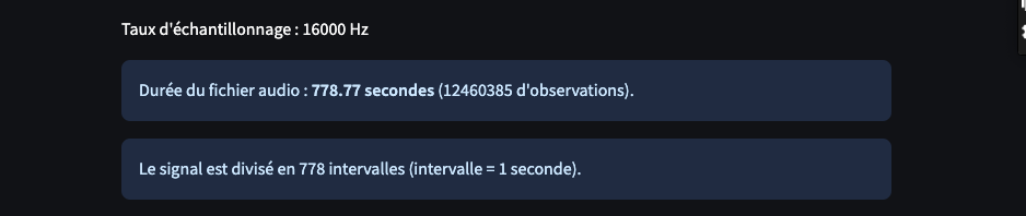 Supposons que notre fichier audio de 777 secondes soit composé de 12 460 320 observations : Un intervalle correspond alors approximativement à 12 460 320 ÷ 777 = 16 036 observations du signal.